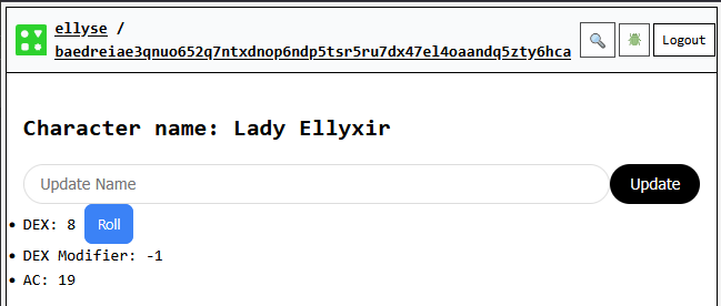 We’ll create a button to roll “dice” for the character’s Dexterity value. This will update the existing value.